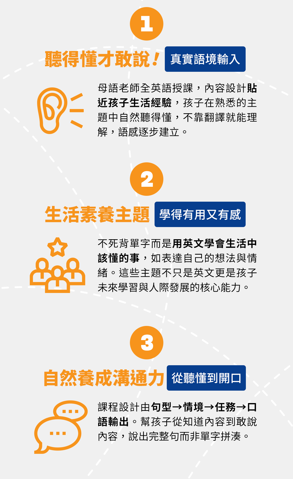 每一堂課都緊扣生活、世界與人際互動,幫助孩子建立英文思考與跨領域理解能力