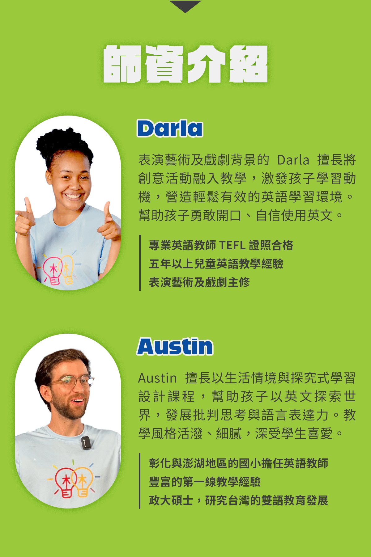 Austin 擅長以真實生活情境與探究式學習設計課程,幫助孩子以英文探索世界,發展批判思考與語言表達力。他的教學風格活潑、細膩,深受學生喜愛。